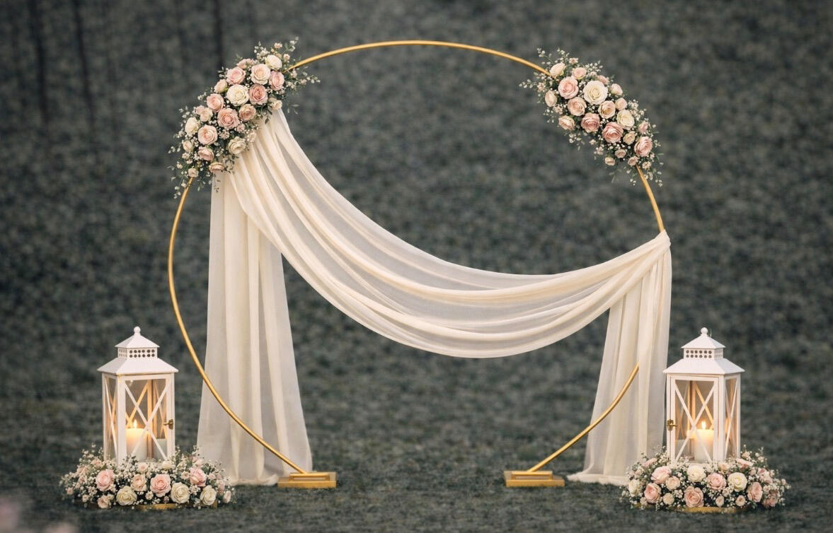 At Alex Bell Styling we curate elegant ceremony settings and beautifully styled spaces that feel timeless, romantic and effortlessly refined.As part of our 2026 styling portfolio, we are delighted to introduce our elegant gold ceremony hoop. Softly draped and styled to frame your vows, it creates a beautiful focal point for photographs and can later be repositioned within your venue as a backdrop for cake cutting and celebrations.The ceremony space can then be complemented with carefully selected styling details such as lanterns, florals, draping and decorative accents to create a cohesive and romantic atmosphere.